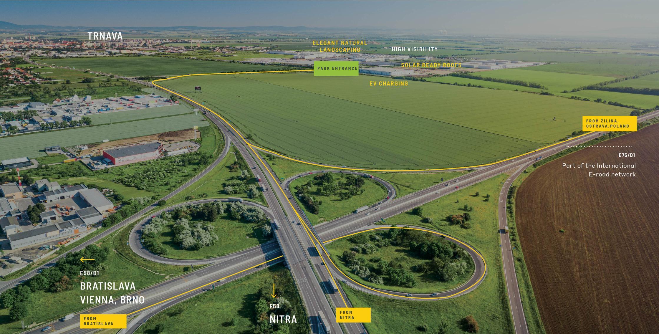 Trnava is an excellent location, strategically positioned at the crossroads of the D1 highway and R1 expressway, and just 50 kilometers from the capital. Situated adjacent to the Stellantis automotive plant, the park is ideal for companies involved in automotive component manufacturing, as well as logistics and distribution activities in Central and Eastern Europe due to excellent accessibility to all major nearby cities and surrounding countries.